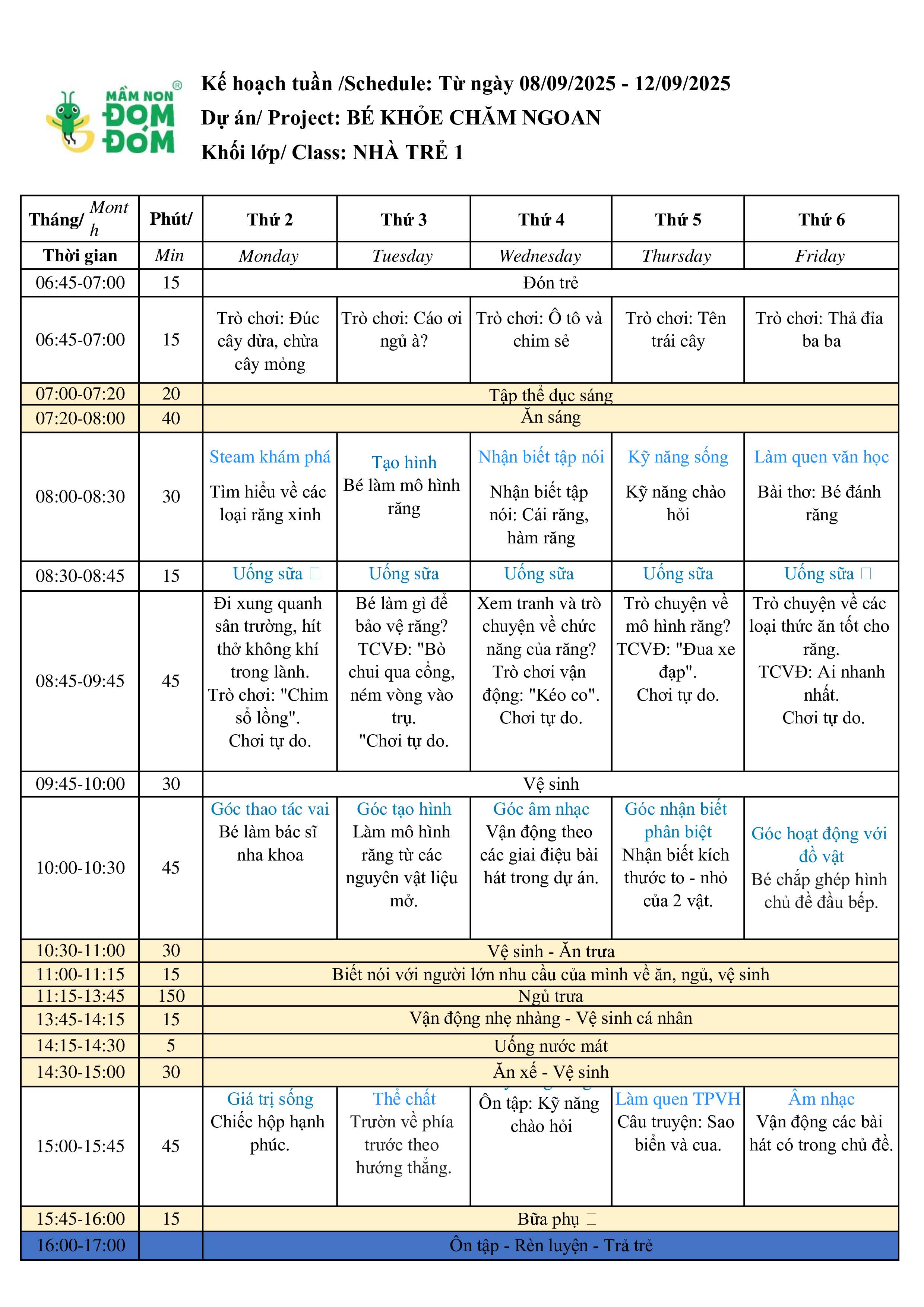 Kế hoạch giảng dạy lớp Nhà trẻ 1 tuần 2 tháng 9