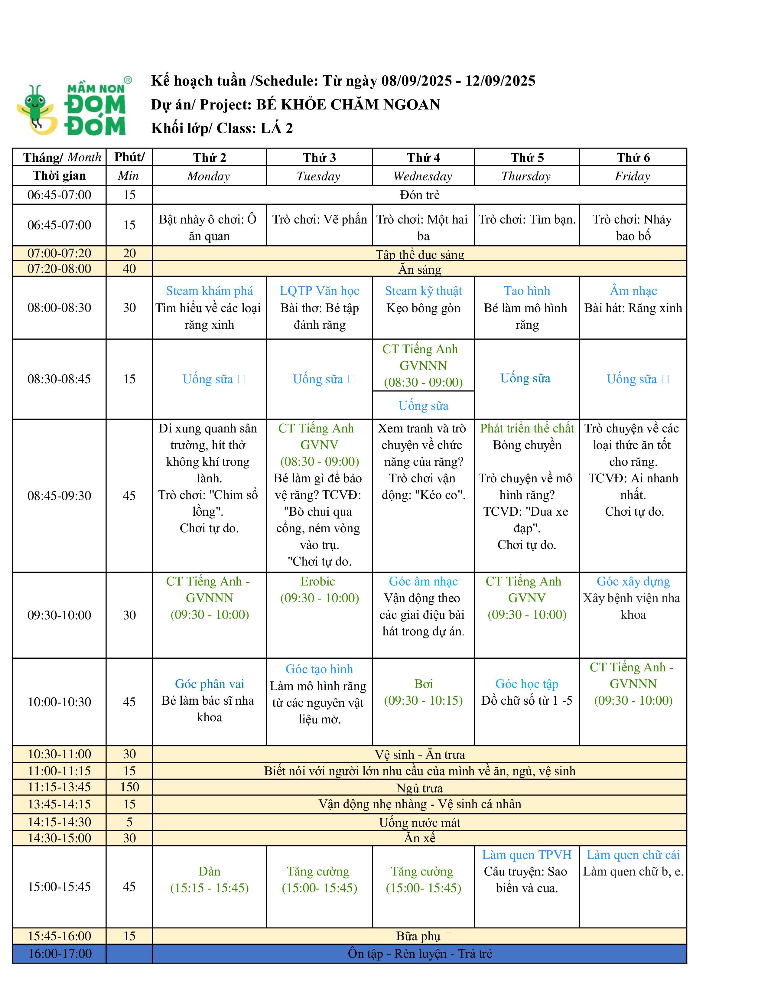 Kế hoạch giảng dạy lớp Lá 2 tuần 2 tháng 9