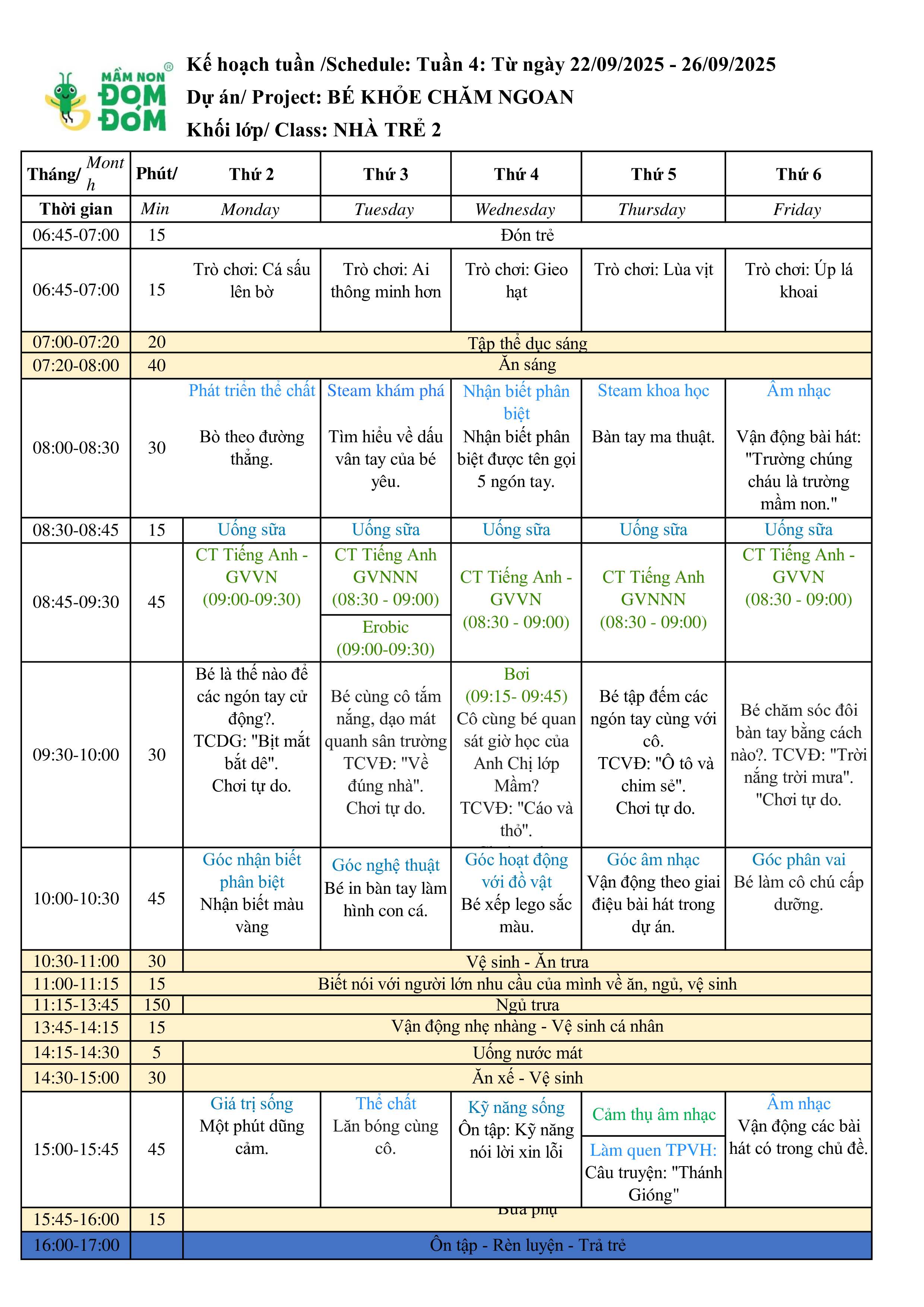 Kế hoạch giảng dạy lớp Nhà trẻ 2 tuần 4 tháng 9